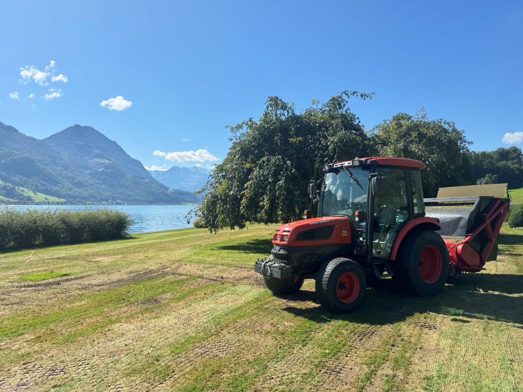 Vertikutieren von Rasenflächen inklusive Aufnahme von Bodenmaterial.
